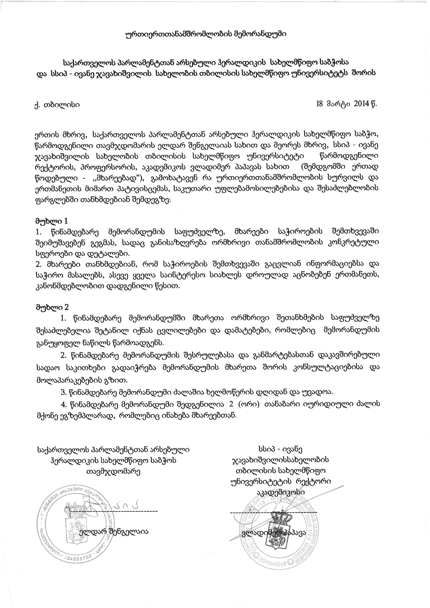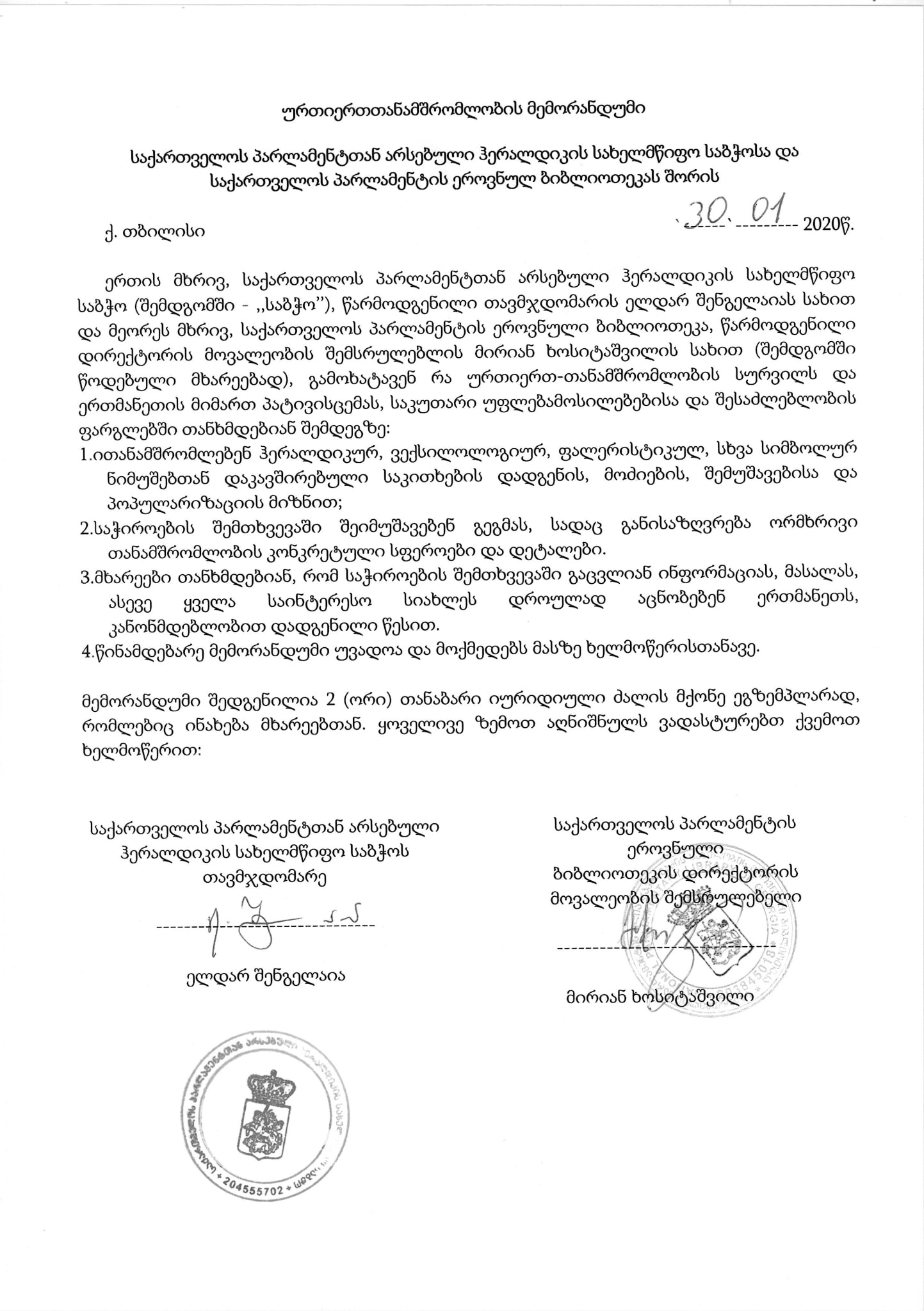 ურთიერთთანამშრომლობის მემორანდუმი საქართველოს პარლამენტთან არსებული ჰერალდიკის სახელმწიფო საბჭოსა და საქართველოს პარლამენტის ეროვნულ ბიბლიოთეკას შორის