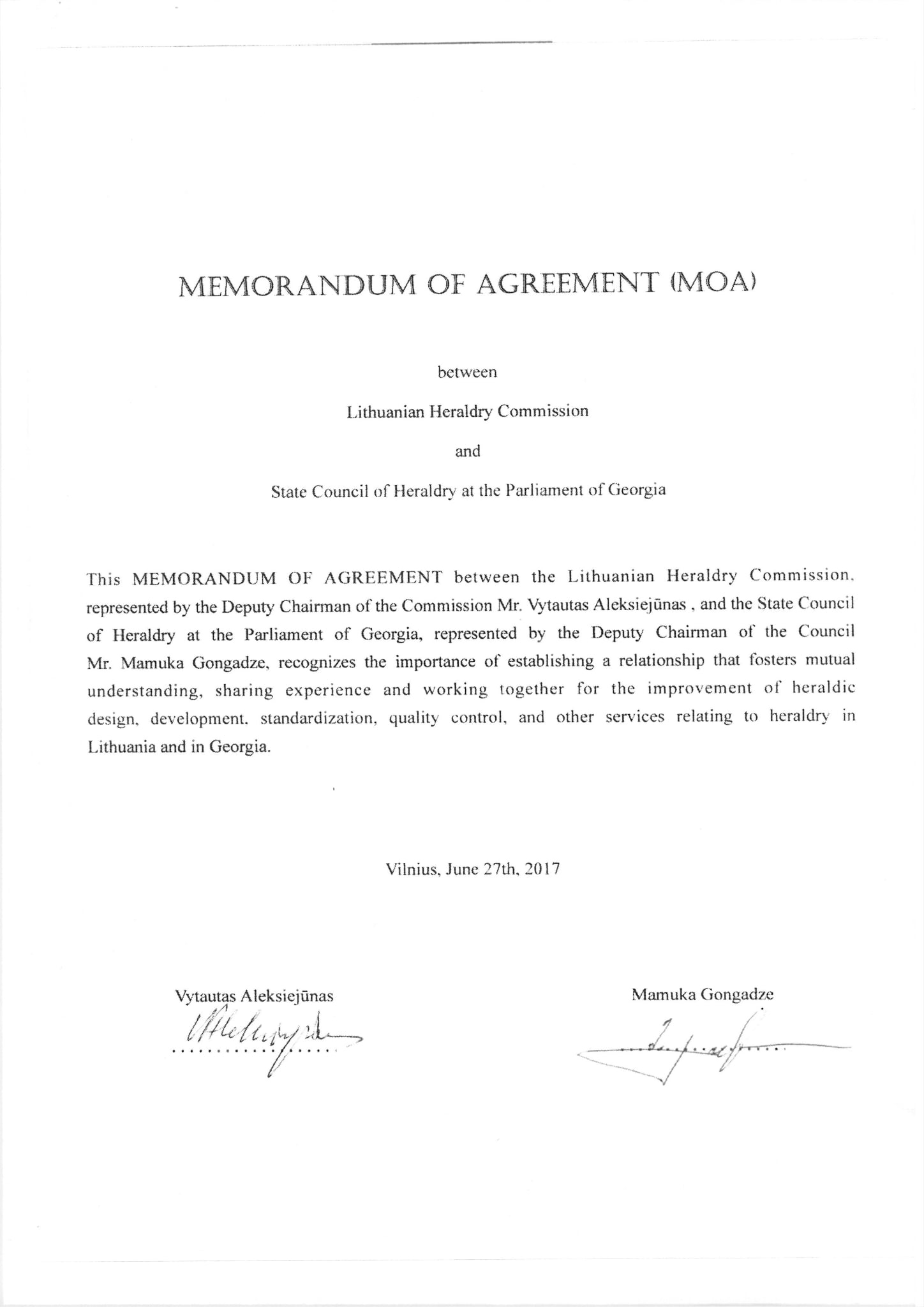 ურთიერთთანამშრომლობის მემორანდუმი ლიეტუვის ჰერალდიკის კომისიასთან